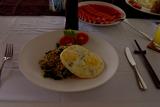 早餐是廚師到Villa裡來烹煮,並以Bali特有的美感,將感覺很日常的印尼炒飯(已經特別註明不要辣味,吃起來舌頭還是被那辣味咬到)、印尼炒麵(是煮過的泡麵下去炒的吧,這個妙法倒是可以學起來自己試試看),搭配著蕃茄和雙黃蛋,擺成十分可口的樣子。我一邊不斷想像著Bali人清晨七點時把相同食物裝入家庭餐具再吃下肚的純樸時刻,一邊很美味地品嚐Villa的第一次早餐。